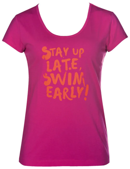 • Damska koszulka Areny to bardzo dobrej jakości T-Shirt ze sloganem dla każdej miłośniczki pływania i dobrej zabawy. Lekki materiał zapewnia odpowiednią termoregulację.