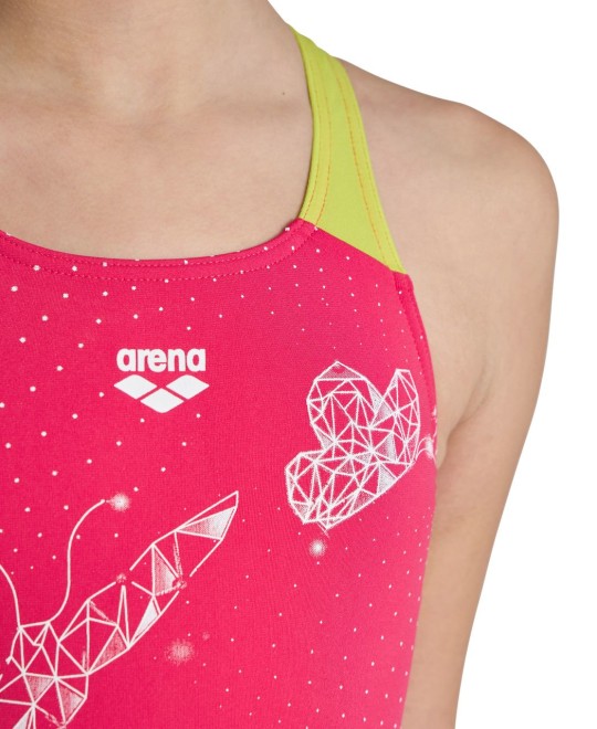 - Elegancki kostium kąpielowy Arena G Butterfly V Back Freak Rose-Soft-Green dla dziewczynek ma piękny design z motywem motyla. Tył w kształcie litery V zapewnia swobodę ruchów i wygodne dopasowanie. Wykonany z tkaniny MaxLife Eco z ochroną UV UPF 50+, szyb